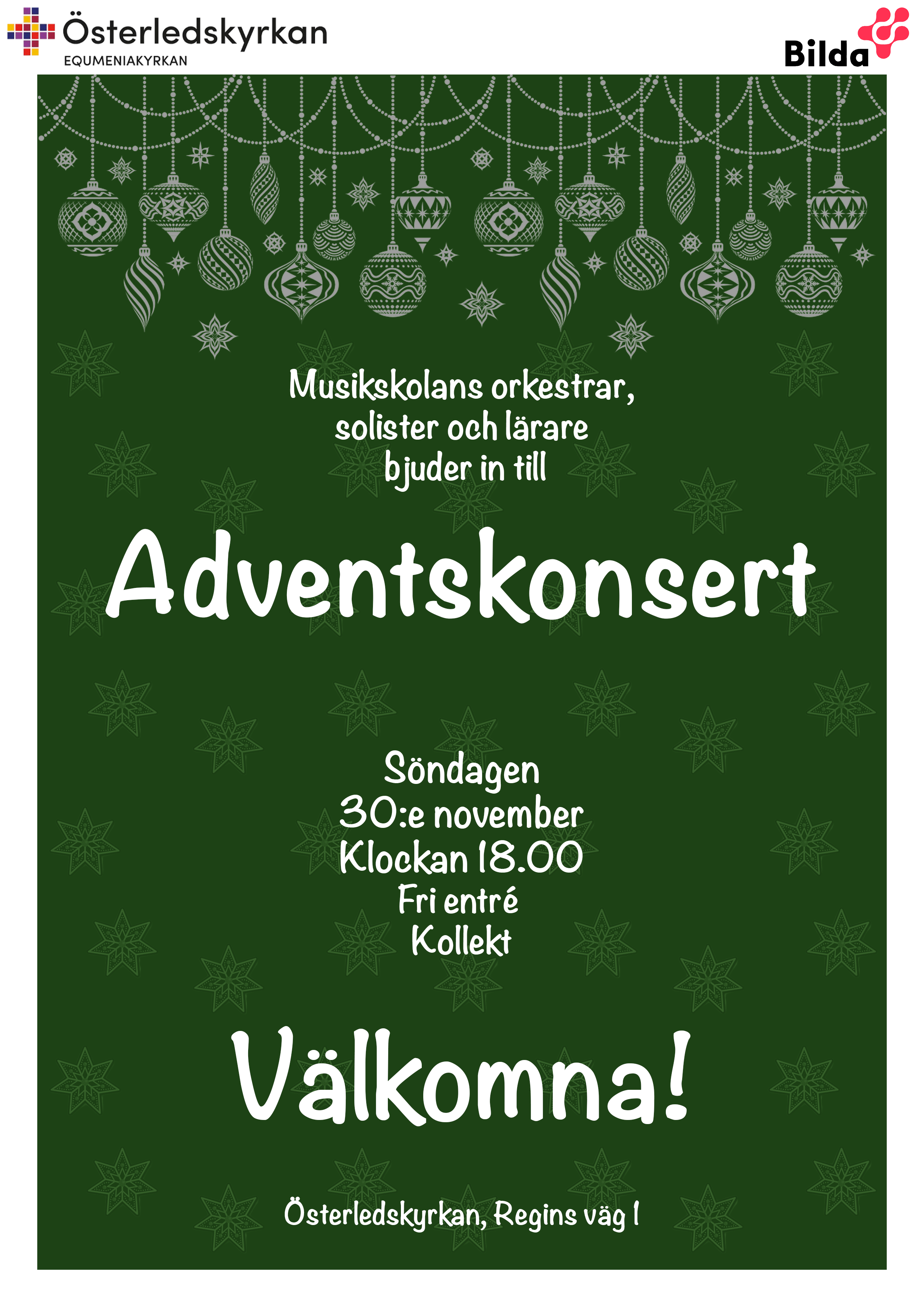 Musikskolans orkestrar, solister och lärare bjuder in till adventskonsert söndagen den 30:e november kl. 18:00. Fri entré, kollekt. Välkomna!