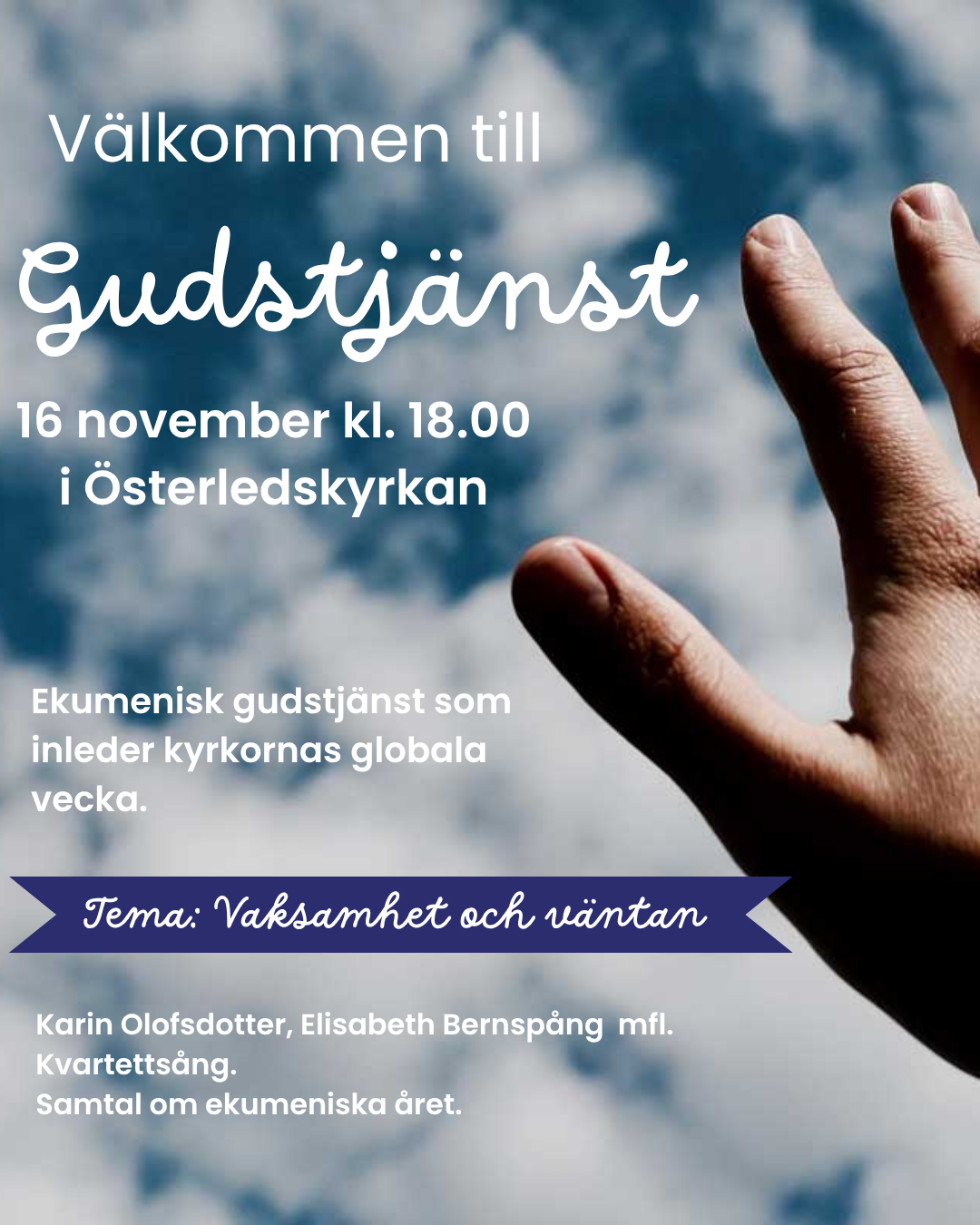 Välkommen till ekumenisk gudstjänst i Österledskyrkan som inleder kyrkornas globala vecka. Tema: Vaksamhet och väntan.