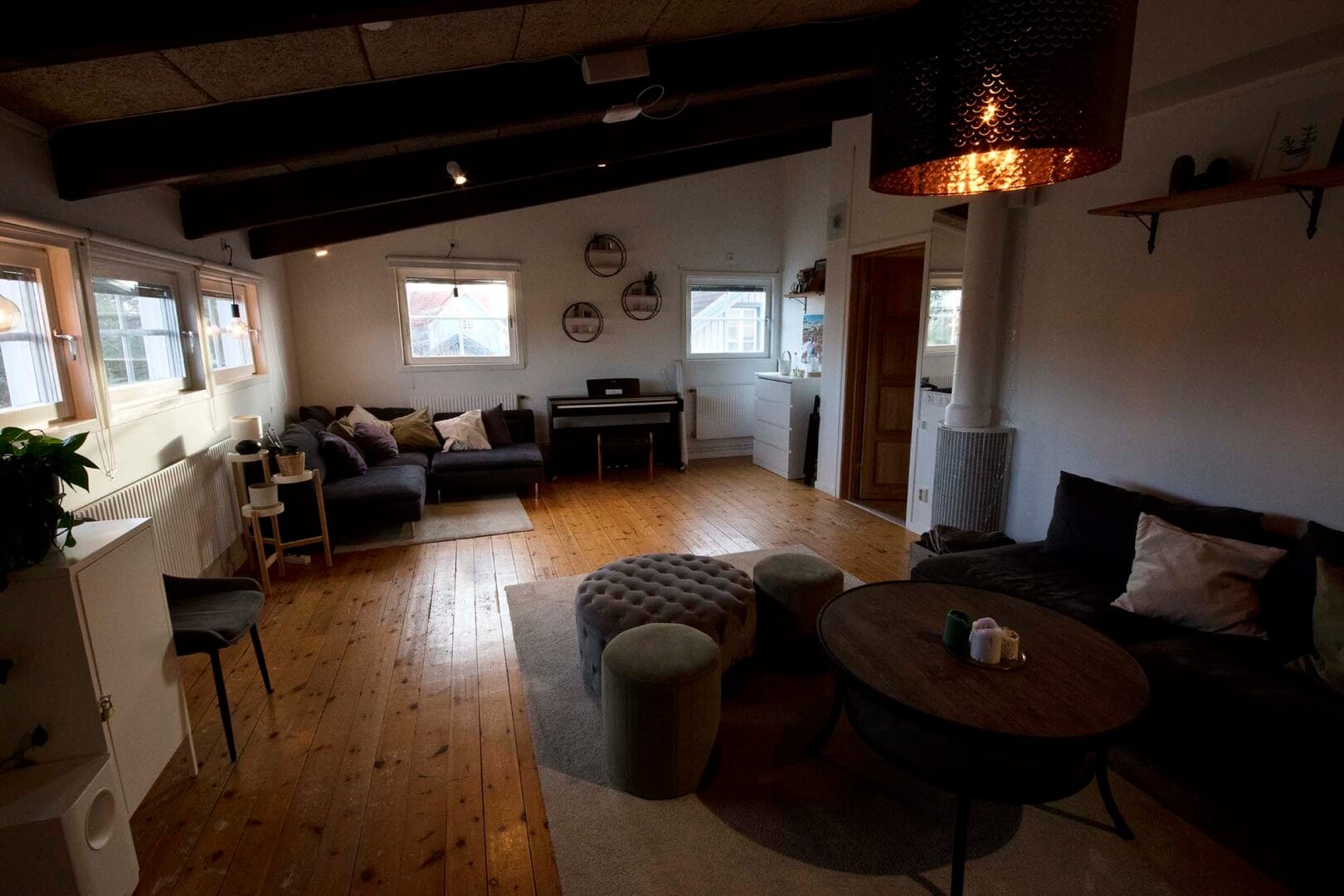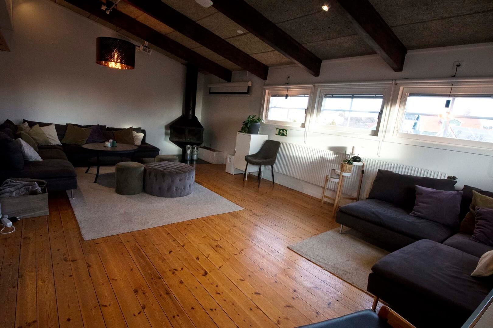 Högst upp i kyrkan finns Gnistan. Med sköna soffor och puffar, vardagsrumsbord och projektor är det perfekt för små möten och samlingar.