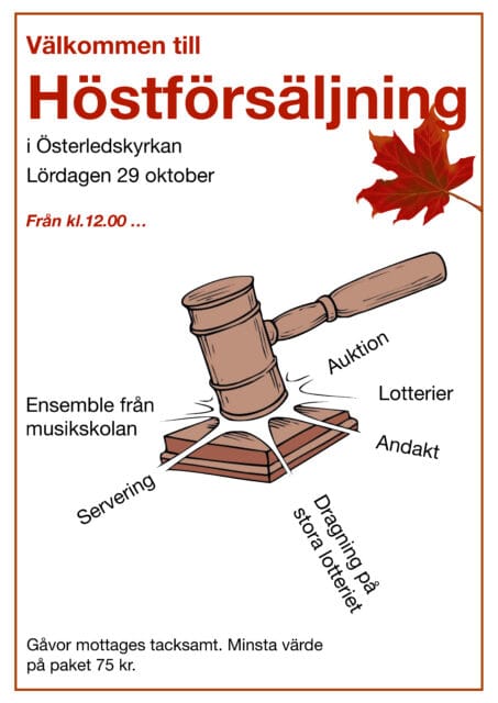 Höstförsäljning med lotterier, servering, andakt och auktion. Musik av ensemble från musikskolan.