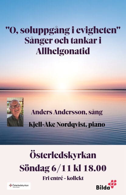 Detta evenemang har redan ägt rum. 6 november, 2022 18:00 - 19:00 O soluppgång i evigheten, sånger och tankar i allhelgonatid med Anders Andersson och Kjell-Åke Nordqvist Fri entré. Kollekt. Lägg till i kalender Google Kalender iCalendar Outlook 365 Outlook Live Dela