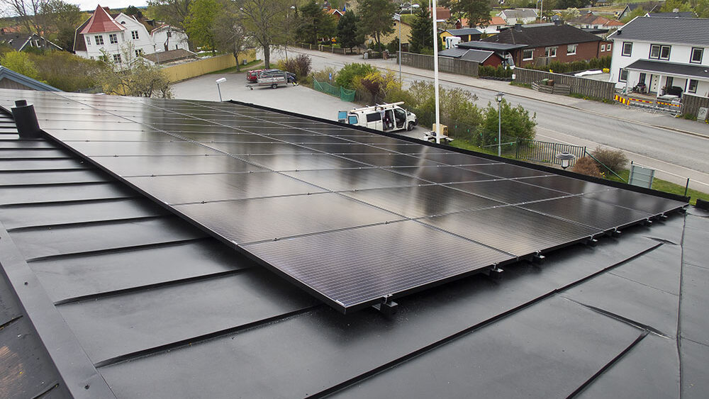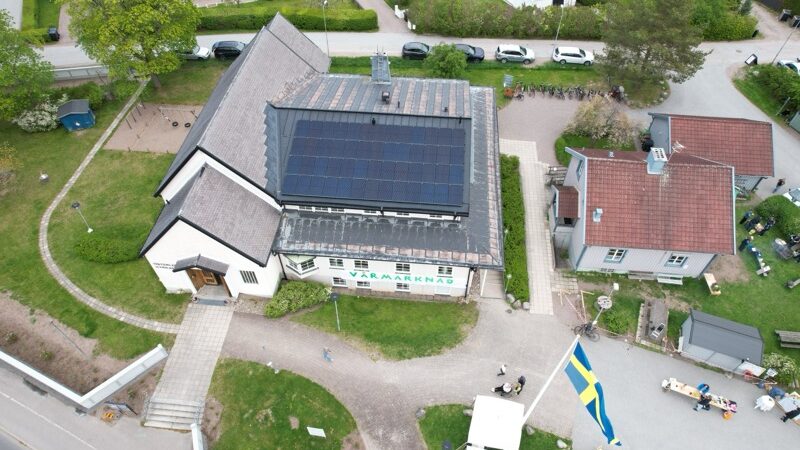 År 2020 investerade församlingen i solpaneler, som sedan installerades på kyrkans tak. Här nedan visas en drönarbild med panelerna i mörkblått på taket. Sedan dess har kyrkan bidragit med miljövänlig elektricitet, både till sin egen verksamhet och omgivningen.